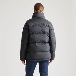 - Shell and Lining: 100% recycled polyester Cuffs: 90% nylon, 10% elastane Fill: 90% goose down, 10% goose feathers