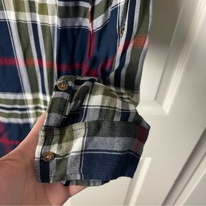Classic plaid mini dress with button-up front. Features a mix of colors for a versatile look. Sleeves can button up as well.