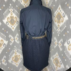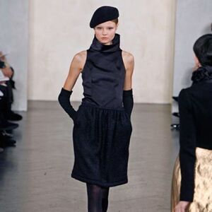 Elegant black cashmere blend soft shape skirt. Beautiful intricate basket weave texture with a subtle reflective finish. Wonderful basic, that’s classic yet modern. Rolled edge waist and hem, side seam pockets, slip on, double hook & eye close waist, soft natural pleats, above knee length, with full silk lining. Super flattering and forgiving fit. Flat approx: 14” waist, 20.5” hips, 19.5” length. Gently used, lovely condition. See pics.
