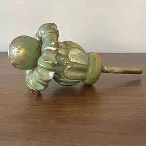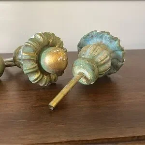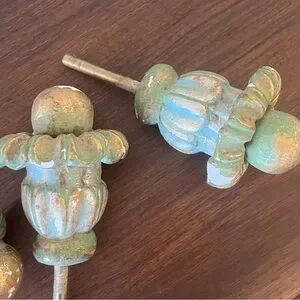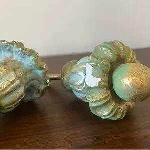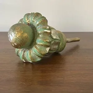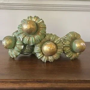 Gorgeous Set of 4 Vintage Plaster Finials, painted in a beautiful shade of green over blue with an overall gold wash, mounted on brass rods. These are hard to describe but the photos show a true representation of their actual appearance. They definitely show wear with chips to the plaster, but they have a beautiful patina that only comes with age!