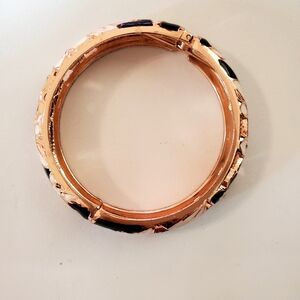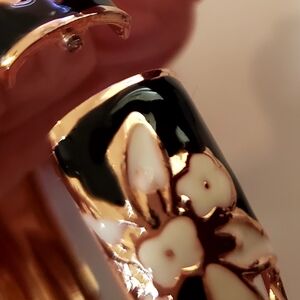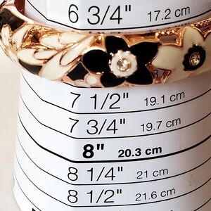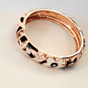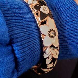 Chic and stylish Cloisonne floral goldtone signed bangle bracelet in black and white. 7.25" Like new