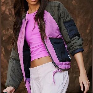 Free People FP Movement Outta Left Field jacket in a pink and green colorblock with quilted panels and nylon detailing. Relaxed/slouchy fit, hip-length, Thermoplume insulated, wind- and water-resistant nylon accents, full zip with windflap, cargo-style pockets, adjustable drawstring hem, made with recycled materials. New without tags. Approx measurements: 20” chest, 22” length.