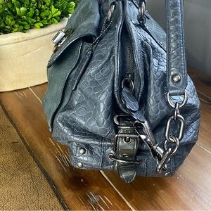 This ultra-rare Sadie satchel from 2010 blends croc-embossed leather, smooth suede, and patent accents in a moody deep blue-gray hue. The whipstitched handles, studded details, and heavy gunmetal hardware give it a bold, sculptural edge—while the unique bronze turnlock and six-link side chain add luxe dimension. The interior? A rich teal satin lining that feels as decadent as it looks.
