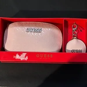 Elegant pink cosmetic bag with matching keychain. Features Guess logo. Perfect for travel or daily use.