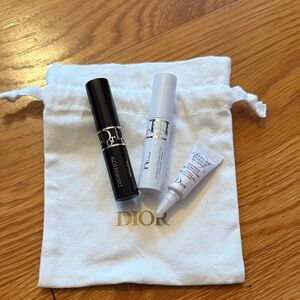 Elegant Dior makeup set. Includes black mascara, white primer, and eye cream. Comes with a branded pouch.