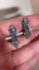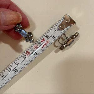 Get ready to sparkle in these retro earrings. A classic pale blue colored glass earrings. Designed with a large emerald cut glass stone with three rounds at the top and bottom giving a twinkling effect. Each stone is prong set in a silver tone metal with an easy to use screw back. Very slight signs of vintage wear on these gorgeous deco style earrings.