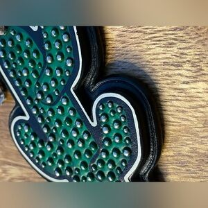Studded leather cactus bag charm with silver tone hardware. Measures 7” from top of latch to bottom of charm.