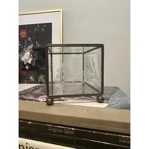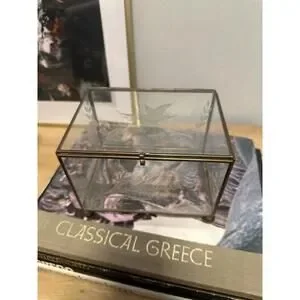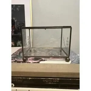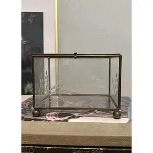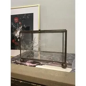 This vintage glass and bronze jewelry display catch all box features a beautiful floral design, making it a decorative and functional piece for storing jewelry or other small items. The intricate etching and vintage aesthetic add a touch of charm to any space, while the compact size of 6" in length, 4" in height, and 4.25" in width makes it suitable for various decor styles. A unique and charming addition to any collection, this original piece is sure to add a touch of vintage flair to your home.
