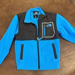 Stylish and warm fleece jacket. Features bold blue and classic black. Ideal for outdoor fun. Size 6