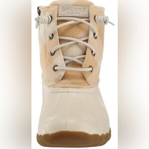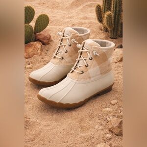 Classic and cozy Sperry Saltwater duck boots featuring a neutral buffalo check upper with a waterproof rubber lower. These are a perfect cold-weather staple — practical, stylish, and easy to pair with jeans or leggings. Lace-up front, cushioned interior, and durable traction sole. Great for snow, slush, rain, or everyday winter wear.