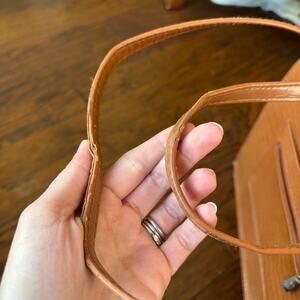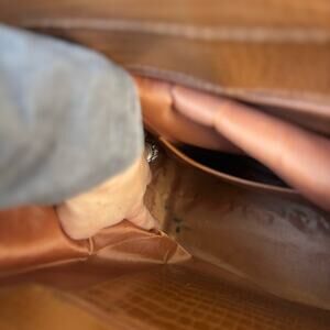 **has some wear at the straps and corners and an ink stain on the interior. Corners of bag are slightly turned in from use. Please see last 6 photos for wear. Overall in good condition.