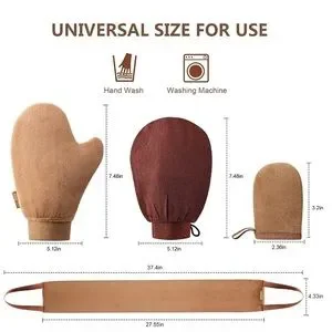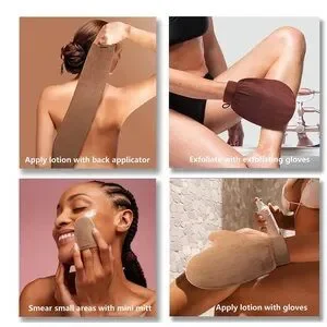 Full Body 4-in-1 Tanning Gloves SetThe CeleCily tanning mitt applicator set covers all the applicators you need when applying tanning lotions. Our mitt set includes 1 exfoliating glove, 1 self tan mitt applicator, 1 mini self tanner applicator, and 1 back lotion applicator for back, no matter apply the details or your back, you can do it all by yourself, achieve to the real self tanning like a pro.