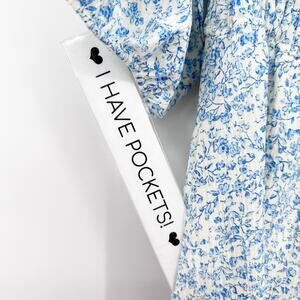 Baltic Born Koa Short womens dress in blue and cream floral. Sweet, feminine mini with the perfect blend of comfort and style. This version features a soft cream base with a light blue ditsy floral print, a flattering deep V-neckline, side slash pockets, and pretty 3/4 puff sleeves. The wide smocked waistline cinches comfortably while creating a beautiful, flowy A-line silhouette. Fully lined for easy wear and made in Baltic Born’s signature romantic floral style. Size small. Excellent used condition. No flaws detected. See measurements for proper fit.