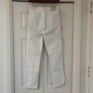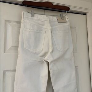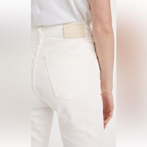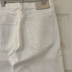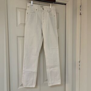 Designed with a high rise and cropped straight leg, which has a slim fit through the hip and thigh. Non-stretch denim will soften with wear. Does have some discoloration on back pocket (in photo).