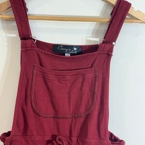 Stylish burgundy jumpsuit featuring a convenient front pocket and adjustable waist tie. Perfect for casual outings.
