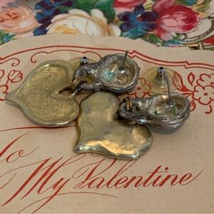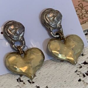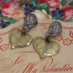 Hammered Heart Dangling Pierced Earrings - Unbranded. Mixed metal gold toned heart and silver toned knot. Gently used, very good condition, one post is slightly bent, see pictures for details.