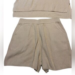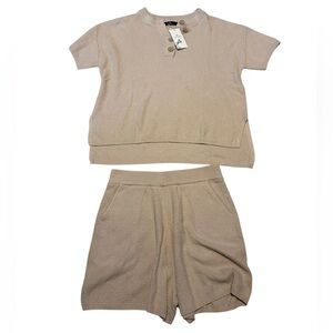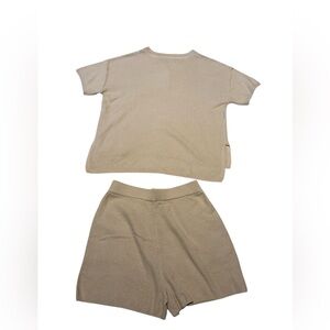 Stylish beige knit top and shorts set. Features a button detail on the top. Great lounge wear, very soft.