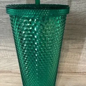 Vibrant green studded tumbler with matching straw. Perfect for cold beverages.