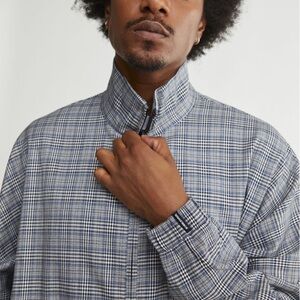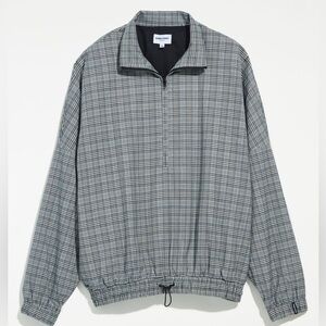 Modern athletic pullover jacket by BOBBLEHAUS with a partial zip at the neck. Topped with an allover plaid pattern. Finished with elastic trims. Plaid pants with elastic