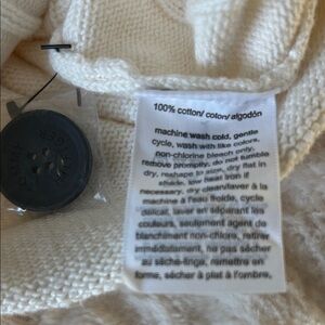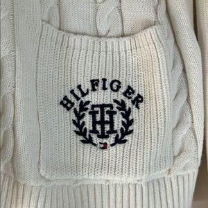 Elegant cream cardigan with bold red cuffs. Features cable knit pattern and front pockets. 100% cotton. Embroidered TH logo detail adds a stylish touch. New with tags! Has two faint pulls in back. Measurements lay flat: