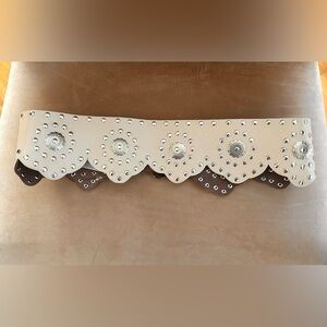 Features: Soft leather with smooth finish, studded detail throughout, wider width, metal buckle, adjustable fit