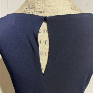 Sophisticated dark blue midi dress. Features a sleeveless design. Ideal for any occasion.