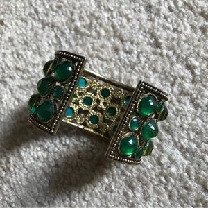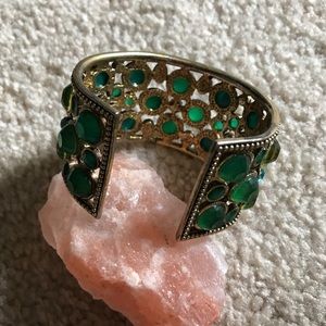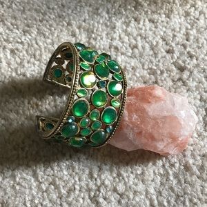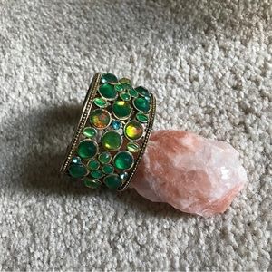 Various sizes of iridescent sea color greens cabochon jewels set in a antique brass colored cuff. Stunning statement piece! Really catches the AB shine!