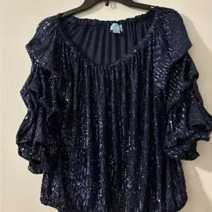 Chic blouse with shimmering sequins. Features ruffled sleeves. Perfect for a night out.