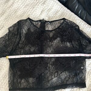 Elegant black lace crop top with floral details. Perfect for a night out.