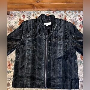 Chic black jacket with unique texture. Features a stylish collar and zip closure.
