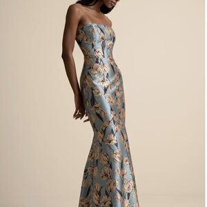NWT Lulus Gowning Around Slate Blue Floral Jacquard Strapless Maxi Dress