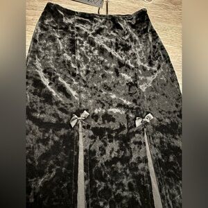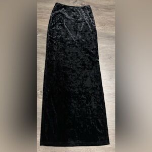 This maxi skirt has a high rise waistline, slits up both sides, and a crushed velvet fabric design.
