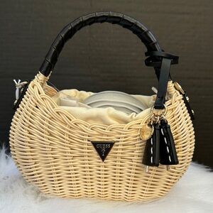 Stylish Guess woven bag with sleek black details. Ideal for versatile wear.