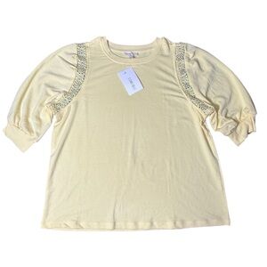 Beautiful Como Blu top in a soft cream/light yellow shade. Features delicate lace trim along the shoulders and feminine puff sleeves. Comfortable and versatile—perfect for casual outfits or dressing up with jeans or skirts.