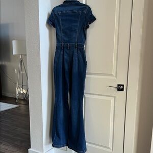 Chic denim stretchy jumpsuit with flared legs. Features a stylish collar and short sleeves. Ideal for casual wear. Excellent condition.