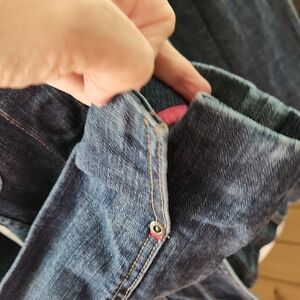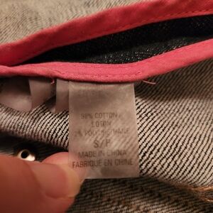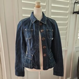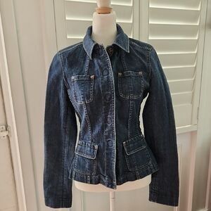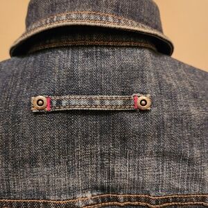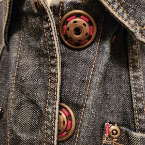 Vintage Y2K denim jacket with pink lining trim details from Elie Tahari. Features accented snap button front and fitted design. From non-smoking home and free from wear and stains.