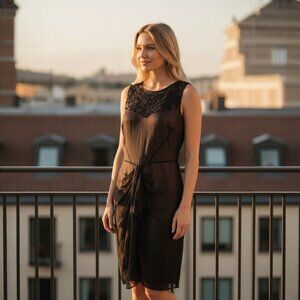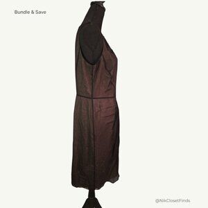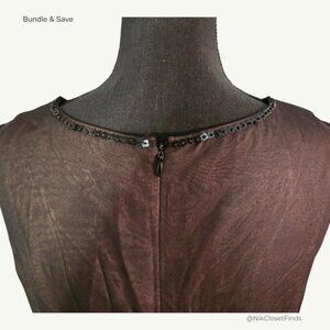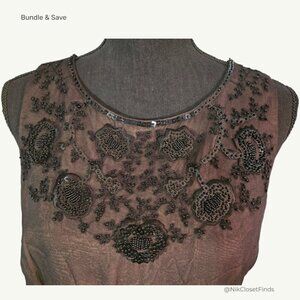 Elevate your wardrobe with this stunning Anne Klein silk dress, featuring intricate black beadwork and embroidery across the bodice. Crafted from sheer overlay fabric with a fully lined interior, this sleeveless piece blends vintage elegance with modern sophistication.