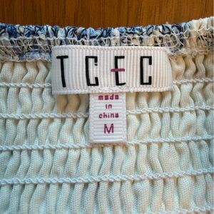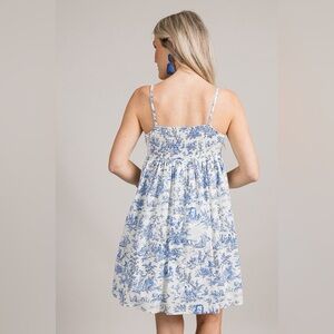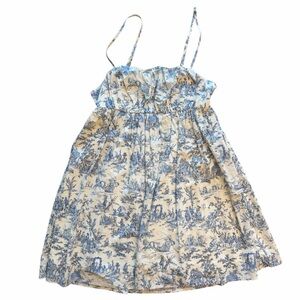TCEC blue toile print sundress in size Medium. Classic cottagecore-inspired floral toile with a flattering empire waist and breezy A-line silhouette. Features adjustable spaghetti straps, smocked back panel for comfort, and a side zip closure. Fully lined and lightweight—perfect for spring, summer, vacations, brunch, or garden parties.