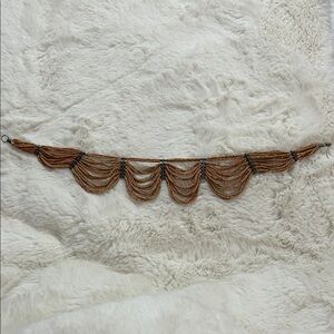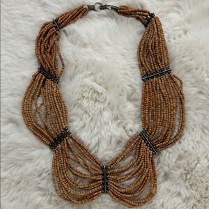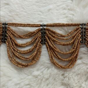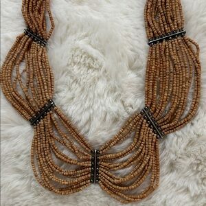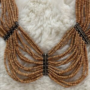 This elegant natural wood beaded brown necklace is perfect for adding a touch of sophistication to any outfit. The intricate design and rich color make it a standout piece. Small delicate wood beads are strung and accentuated by a hematite like beaded support structure. Elegant draping adds drama with richness of wood making it a more hippie boho grounding type of look.