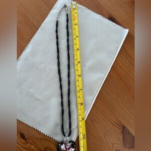 Murano style glass heart pendant with pink flower and glitter accents. Black beaded necklace has a 10” drop and a claw closure.