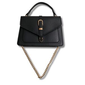 A sleek, structured mini bag designed for polished everyday styling. Finished in smooth black vegan leather with gold-tone hardware and a removable chain strap, this top-handle silhouette transitions effortlessly from day to night. Carry it by hand for an elevated look or wear it crossbody for hands-free ease.