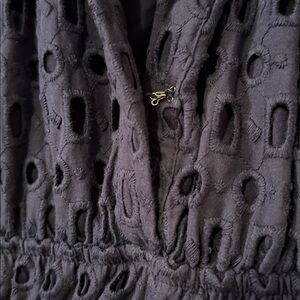 Chic navy mini dress with eyelet design. Short sleeves and ruffled hem. Perfect for casual outings. Eye hook needs a few stitches to be more secure.