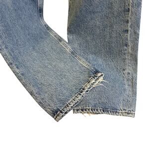 Features a vintage medium blue wash, high rise fit with a criss cross waistband, straight leg style and raw frayed hems. Fitted at the waist and hips, loose from the thigh down. Structured 100% cotton non stretch denim, 5 pocket styling and button closure. beautifully made, premium feel, and the perfect day to night jean. Excellent preowned condition, no flaws.