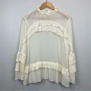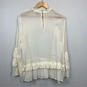 Feminine blouse with a loose fit, long sleeves, and beautiful frill details on the sleeves, chest and on the waist. The shirt has a mock neckline with a button closure, placed on the back of the blouse.