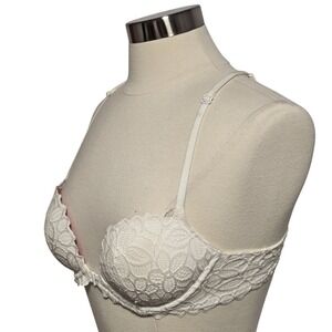 Delicate floral lace overlays this charming PINK Victoria's Secret Underwire Bra, creating a beautifully intricate design. The front closure offers easy on and off, while the racerback style ensures comfortable support and a flattering silhouette. Its soft white hue and scalloped lace edges add a touch of feminine elegance, perfect for layering under sheer tops or wearing on its own for a touch of romantic flair. Ideal for casual everyday wear, a romantic date night, or a beach vacation.