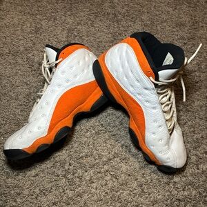 Step up your style with these Jordan sneakers. Featuring a sleek white design with vibrant orange accents, these shoes offer both comfort and flair. Perfect for any casual outing. Normal wear minor marks light crease