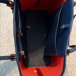Bold red and navy tote with circle design. Features dual handles and signature charm.