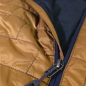 Gold/Copper down jacket by Patagonia. Features a front zipper and hood. Discontinued/ RARE