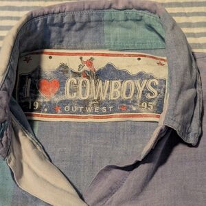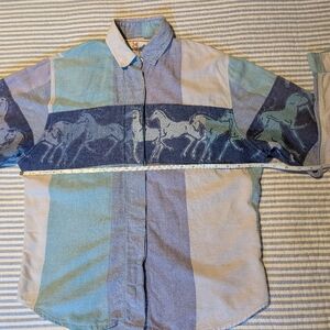 I Love Cowboys, Vintage horse embroidery button down. Size unknown, likely medium to large. Colors include various blues. Lightweight and lightly worn, has all buttons.