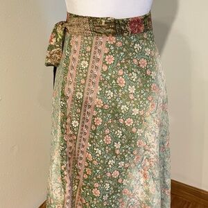 Embrace elegance with this floral maxi skirt. There are two sides to this material, the first featuring a pink, green, and gold floral pattern and the other side featuring more of a blue and pink tone floral pattern. The wrap feature, which goes through a small keyhole hidden in the waistband, allows you to customize and display whichever side of the fabric you prefer. Is a One Size, I find it does fit a Small - Large very good since you can tie it where you want.